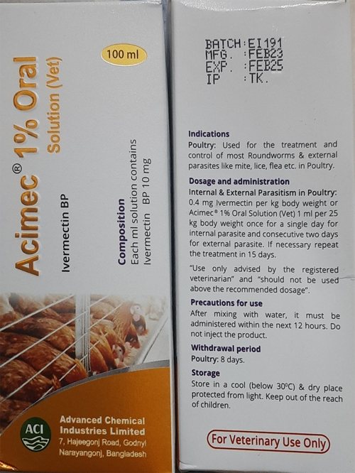 • DOSAGE AND ADMINISTRATION For internal and external parasites of poultry: 0.4 mg ivermectin per kg body weight or, Acemac 1% oral solution (VET) 1 ml per 25 kg body weight mixed in feed water once for internal parasites and for ectoparasites on two consecutive days.
