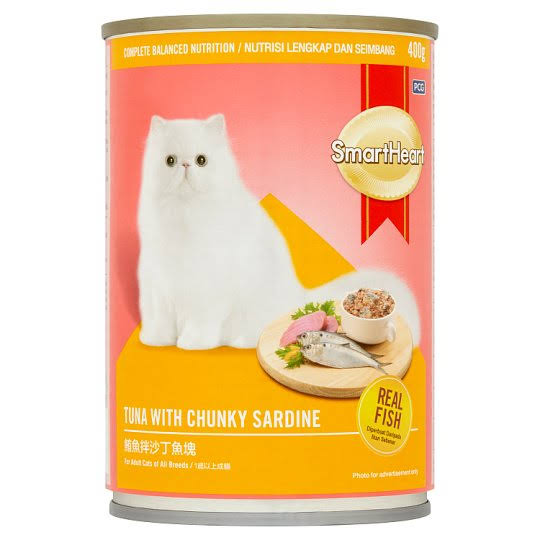SmartHeart® Tuna with Chunky Sardine canned cat food is a delicious meal providing 100% of all essential nutrients that cats need to stay healthy and strong. Its Complete & Balance Nutrition. Made of Quality meat to provide amino acids to maintain good muscle mass to give high protein. Optimum fat ensures high energy and essential fatty acids to maintain healthy skin and shiny coat. All necessary Vitamins For body functions and enhancement of the immune system are included. All necessary Minerals For body functions and strengthen bones and teeth are included. Taurine Plus ensures proper eye function.