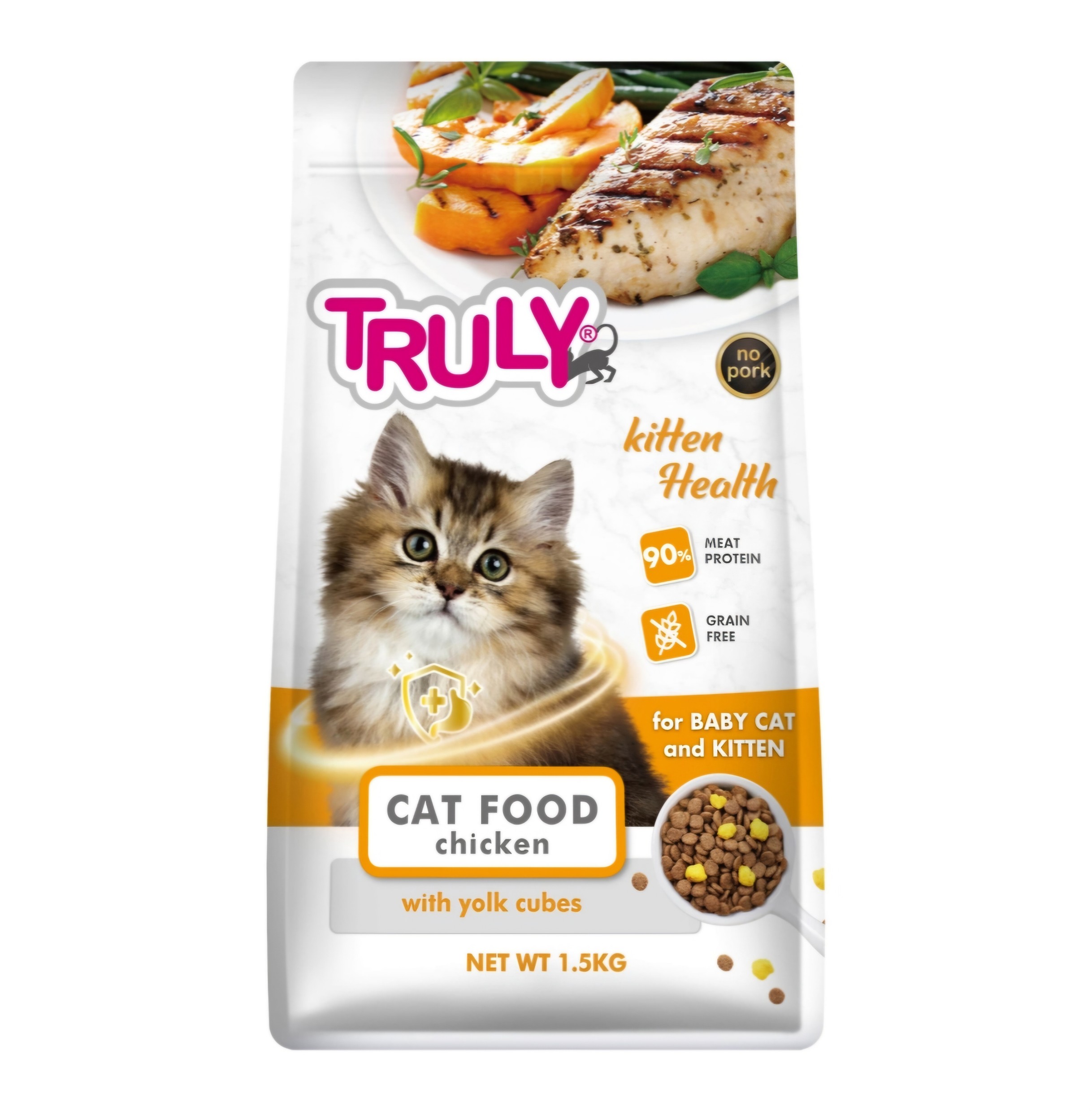 Truly GRAIN FREE Kitten Health Chicken is the Complete & Balanced Nutrition for Your Kitten. Truly is Currently one of the Best Food Available in Bangladeshi Market. Truly is GRAIN FREE Catfood Which Means Truly Inclues NO CORN, NO SOYABEAN, NO RICE, NO POTATO, NO WHEAT. Even, It doesnt Have any Genetically Modified (GMO) Products. NO COLOUR is Added, Even NO ARTIFICIAL SWEETNERS, NO CHEMICAL FLAVOURINGS are Added. Truly Includes REAL EGG YOLK Cubes which Makes Your Kittens Crazy. Many Natural Herbs, Vegetables and Fruit Extracts are Also Added to Give Your Kittens Best Nutrition. Truely, It will be the Best Feeding Experience for Your Kittens. This Delicious Meal Providing 100% of All Essential Nutrients that Cats Need to Grow Healthy and Strong. Made with Best Quality Ingredients Sourced from Nature. Made of Quality Meat to Provide Amino Acids to Maintain Good Muscle Mass by Giving HIGHEST PROTEIN. Optimum Fat Ensures High Energy and Essential Fatty Acids Maintain Healthy Skin and Shiny Coat. All Necessary Vitamins for Body Functions and Enhancement of the Immune system are Included. All Necessary Minerals for Body Functions and Strengthen Bones and Teeth are Included. Added Omega 3 & 6 Ensure Shiny & Beautiful Coat & Healty Skin. Extra Probiotics & Prebiotics Help Boosting Immunity. Taurine Plus Ensures Proper Eye & Brain Function. It's HYPOALLERGENIC which means Felicia Causes NO ALLERGIC REACTION to your Kitten's Skin.