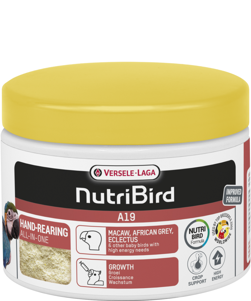 Hand-rearing food for macaws, African greys, eclectus parrots and other baby birds with a high energy requirement