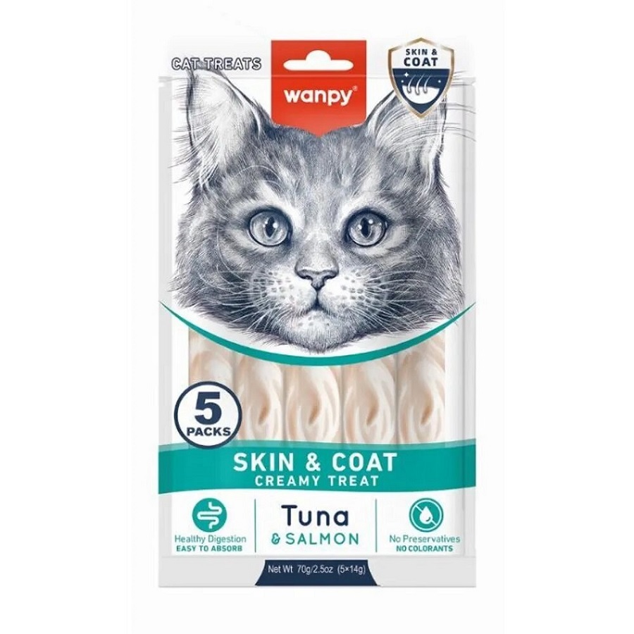 Wanpy Creamy Treat Skin & Coat with Tuna & Salmon is a delicious and nutritious treat that supports healthy skin and a shiny coat in cats. Made with real tuna and salmon, this creamy snack nourishes your cat’s skin and fur while providing a tasty reward.